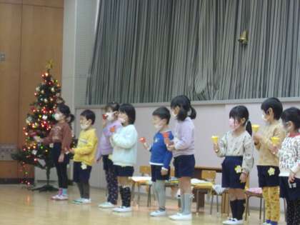 今日はお楽しみ会!遊戯室が華やかに飾り付けられ、楽しい音楽も流れて会が始まりました。ツリー点灯では、一転静かに光を眺めていました。すると、遠くから「シャンシャン」と鈴の音が!