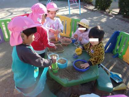今日は一段と寒い日でしたが、日向にみんなで集まって砂場やフープなどで遊びました。