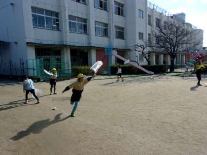 今日は、お試しで紐の短い凧を園庭であげてみました。