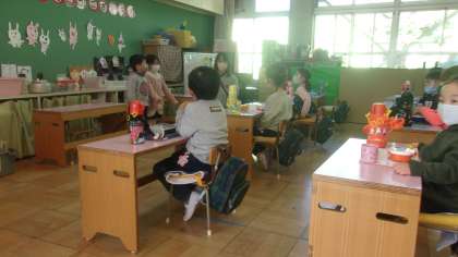 もう一つの久しぶりは、みんなで食べるお弁当。4歳児は、当番の子どもたちが「いただきます」のあいさつをしました。みんなで食べるお弁当はおいしいですね。