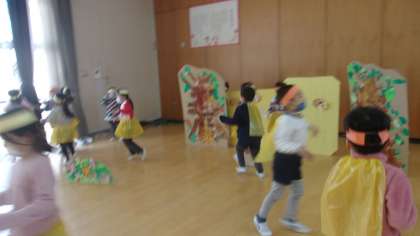 生活発表会の予行で互いの劇遊びや歌・合奏を見合ったことで、「きくぐみさんのハチの飛び方が上手だった」「ももぐみさんの歌、かわいかったなあ」と刺激を受け合いました。