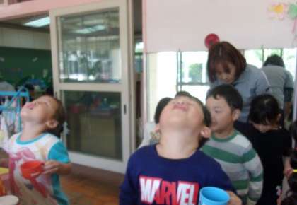 年少児は、正しい手洗いとうがいの仕方を2回にわけて話をしました。手や喉には目に見えないばい菌がたくさんあることを視覚物から伝え、実際に子どもたちと一緒に行いました。「あわあわてあらいのうた」の音楽をかけながら6つの手のポーズで手洗いをし、うがいは「がらがらぺっ」と「ぶくぶくぺっ」の2つをしました。初めてする子もだんだん上手になってきている様子が見られています。