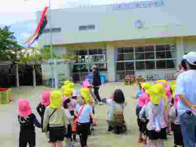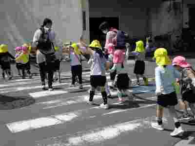 行き帰りは5歳児がしっかりとペアの4歳児の手を繋ぎ、信号や交通ルールに気を付けて歩きます。このような実際の経験を通して交通安全や公共のルールやマナーを身につけます。幼稚園に帰ってくるとこいのぼりが風に揺れていました。楽しかったね。また行こうね。