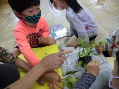 保育室を見に行くと4歳児はスライム遊び、5歳児はアオムシの卵を見つけて過ごしていました。担任が久しぶりに登園する子どもたちを思い、興味・関心に合わせて活動の場を準備していたのです。明日も元気に幼稚園へ来てね。
