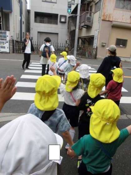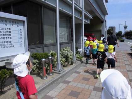 5歳児が「消防署見学」に行きました。消防署までは少し遠かったけれど、友達と力を合わせ交通ルールを守ってしっかり歩きました。