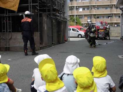 最後に消防士の方が消火訓練されている様子を見学したり、防災ビデオ鑑賞をしたりしました。消防署見学を通して防火の対応を再確認したり、消防署の仕事に関心をもつ貴重な機会になりました。