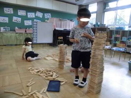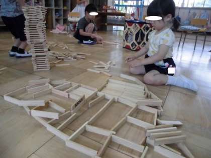 保育室の中が静かだなと思ったら、じっくり集中して遊ぶ姿がありました。「高く積みたい」「お家みたいにしたい」と自分なりに目的や目標をもって遊んでいます。どうしたら上手くいくのか考えたり工夫したりしています。こんな時間が大切ですね。