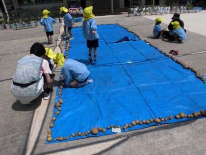 榎本小学校の敷地内にある「えのもとの森」の畑に植えたジャガイモの収穫をしました。子どもたちは土の中から出てくるお芋に大喜び。5歳児はジャガイモが何個採れたかに興味をもち、園庭に並べてみることにしました。10個づつのかたまりにして数を書いたカードを置いていくと。なんと437個もありました。