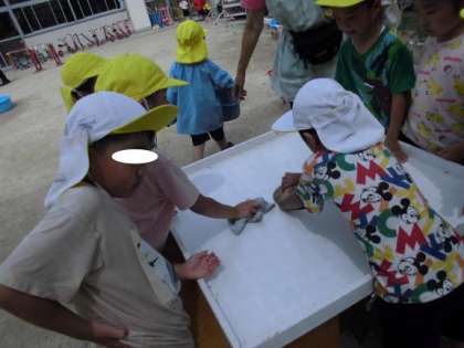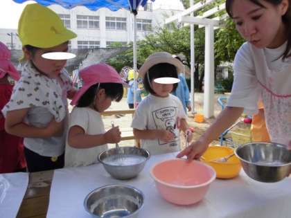 園庭では5歳児・4歳児・3歳児ちゅーりっぷクラブの子どもたちが一緒に、泡遊びやジュース作り・水鉄砲など水遊びを楽しんでいます。異年齢の関わり中で遊び方や使い方を知らせ合っている姿も見られます。遊んだ後は丁寧に後片付けしています。「自分たちが使ったものは自分たちで片づけないとね」と5歳児が教えてくれました。遊びの中で日々成長しています。