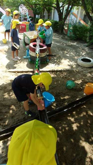 園庭の砂場は、ぶどう棚で木陰になり活動しやすい環境です。今日は5歳児の子どもたちがトユを使い、ゲームボックスやタイヤ、バケツなどで高低差をつけ、水を流して遊んでいました。その内、スコップを船に見立てて流し出しました。トユの組み方やスコップの並べ方、水の勢いなどを考えたり試したりして友達と工夫しながら遊びました。