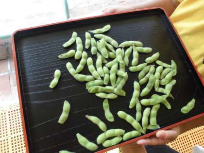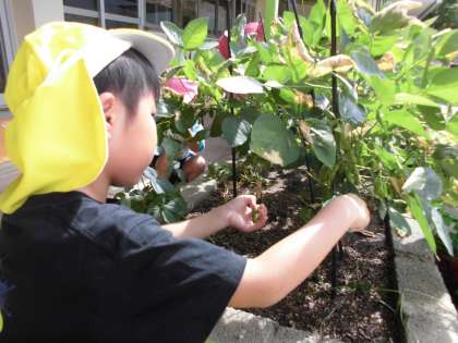 稲と同じく1学期末に子どもたちと植えた枝豆がぷっくり膨らんで、収穫時を迎えました。預かり保育に参加していた子どもたちが「ここにも枝豆できてる!」と、一つ一つ指でつまんで、実の入り具合を確認しながら収穫を楽しんでいました。暑い日が続きますが、夏休み中も園内の植物はすくすく元気に育っています。