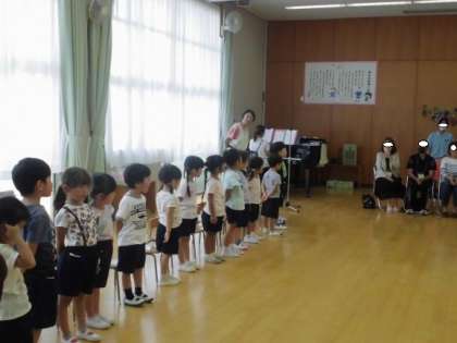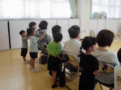 今日は4年ぶりになる「敬老の日のつどい」を行いました。歌を聞いて頂いたり、肩たたきをしたり、手作りのプレゼントを渡したりしました。おじいさまやおばあさまの小さかった頃の話では、「私もその遊び好き」と子どもたちも関心をもって聞く姿が見られました。またコマ回しや絵描き歌・輪回しなどの遊びを見せて頂いたりもして、ふれあいのあたたかさを感じる時間になりました。ありがとうございました。