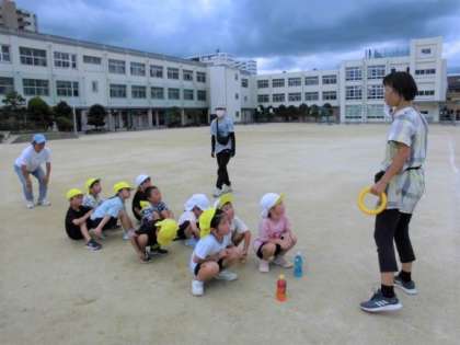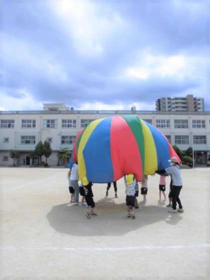 給食時間に隣接している榎本小学校の校庭をお借りして、5歳児がパラバルーンとリレーをしました。広い校庭で「小学生になったみたい」とのびのび活動する姿が見られました。帰りには1年生の教室前を通って帰ってきました。4歳児も5歳児も「憧れの気持ち」が成長を支えていると感じます。