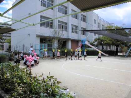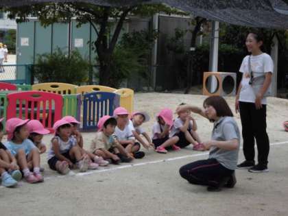 園庭で5歳児・4歳児一緒に開会式ごっこをしました。音楽に合わせて歩く5歳児の姿に「かっこいい」と4歳児は憧れのまなざしを向けています。真剣な表情で「どうしたら早く走れるか」と作戦会議をしている4歳児の姿もとても可愛いです。