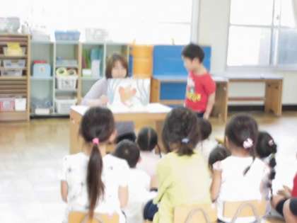 朝、園庭に5歳児が飛び出してきました。見てみると自転車・縄跳び・ボールなどそれぞれ体を動かす遊びに挑戦しています。「○○できるようになりたい」「〇回跳びたい」など自分なりに目標をもって取り組んでいます。4歳児の保育室では大好きなザリガニが出てくる紙芝居を見ています。子どもたちの心の中で大好きなザリガニのイメージが膨らんでいっています。一つ一つが運動会の活動に繋がっていっています。