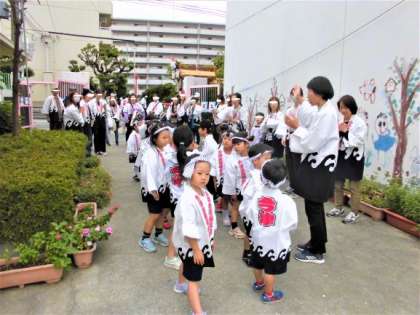 だんじり曳きに参加したよ 公開日 2023/10/16 更新日 2023/10/16 幼稚園日記 10月14日土曜日に希望者園児が地域のだんじり曳きに参加しました。少し涼しいくらいの天候で神社から幼稚園まで元気に曳くことができました。幼稚園に着いた後はだんじりに乗って記念写真を撮らせて頂きました。地域の伝統ある行事にふれる機会になりました。保護者の皆様もご協力ありがとうございました。 いいね(0)