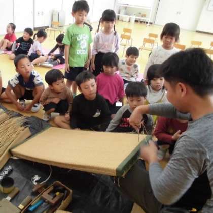 もう一つ作りたいわ 公開日 2023/10/17 更新日 2023/10/17 幼稚園日記 地域で畳屋さんをされている歴代PTA会長さんにおいで頂き、畳コースターづくりをしました。はじめは畳の成り立ちについてお話を聞きました。いぐさを触ったり香りをかいだり、畳の縁を縫っていくところを見せて頂き興味深々でした。コースターづくりもとても楽しかったようで「もう一つ作りたいわ」と話していました。 いいね(0)