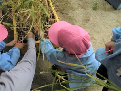 稲刈りをしたよ 公開日 2023/10/20 更新日 2023/10/20 幼稚園日記 数日前から「もうお米できてそう」「だって少し茶色くなってきたもん」と変化に気づいていた子どもたち。交代で稲刈りに挑戦しました。終わった後に「これ落ちてたよ」と何人か稲穂を拾って持ってきた子どもが。「これはお米になる大切なものだ」と思ったからでしょうね。しばらく干しておくことになった稲。これからどうなるかお楽しみです。 いいね(0)