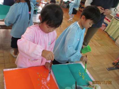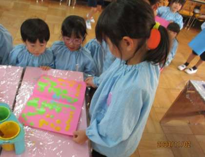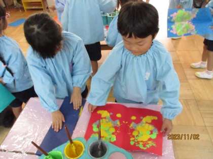 何度も試しながら、「広げるから見ててね」と友達に声をかけたり、「3・2・1」と自分でカウントダウンしてから広げたりして、あらわれる模様や色の混ざり具合を楽しみました。「ここが綺麗」「大きい鳥みたい」と伝えあったり、不思議さや面白さを感じたりして遊びました。