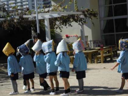 素速く防災頭巾をかぶって園庭に避難する姿が見られました。