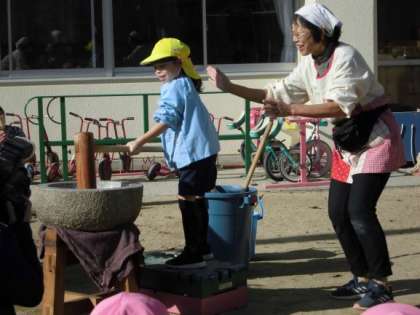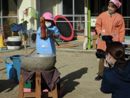 餅つきをしたよ 1 公開日 2023/12/08 更新日 2023/12/08 幼稚園日記 今日は幼稚園で餅つきをしました。 子どもたちは朝からワクワク。 園長先生から餅つきのお話を聞いた後は、 「もちつき」の歌を歌ったり、 手遊びをしたりしました。 いよいよ餅つきの始まりです。 みんなで力を合わせ交代でつきました。 「よいしょー、よいしょー」と みんなの掛け声が園庭に響きました。 いいね(0)