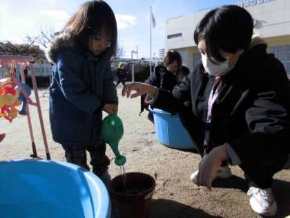 親子でチューリップの球根を植えました。