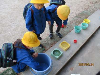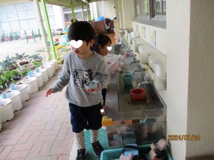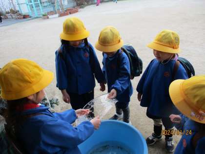 5歳児は、昨日「お水を入れておこうよ」「氷になるかも」と言って、水を溜めて降園しました。すると登園してきてビックリ!「氷になってるー」「見て見てー」と嬉しそうに教えてくれました。