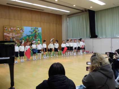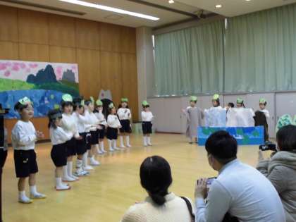 はじまってしまうと、ドキドキよりもワクワクに変わった様子で、きれいな歌声や役になりきったセリフが聞こえてきました。エンディング後、保護者からのアンコールに答えて「こぶたぬきつねこ」のかけあいを子どもたちと保護者とで行いました。