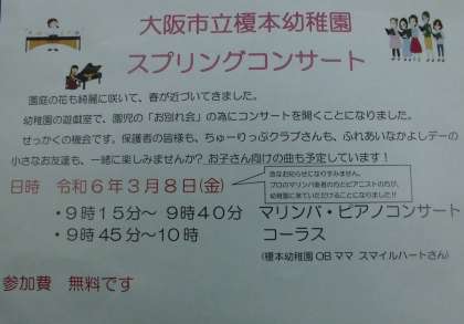 3月8日(金)にスプリングコンサートを行います。プロのマリンバ奏者の方とピアニストの方に演奏をして頂くことになりました。お子さま向けの曲も予定していますので、ちいさなお友達もぜひご参観ください。