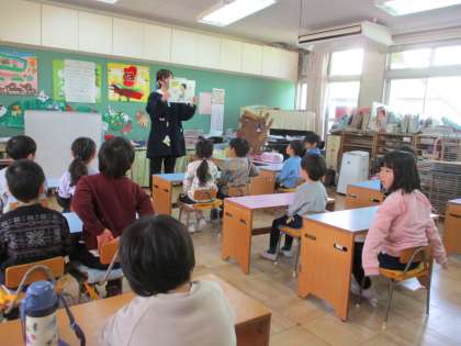 始めに「せなかをぴん」の絵本を読み、正しい姿勢ができているか実際に椅子に座って教師と一緒に確認をしました。せなかはぴん!あしはぴた!てはおひざ!の合言葉を言いながら実践し、机とお腹の距離は手の拳1個分と知らせました。