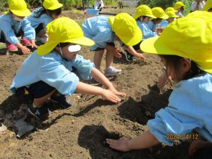 隣接している大阪市立榎本小学校の中にある「えのもとの森」へ行き、5歳児が畑にジャガイモを植えました。