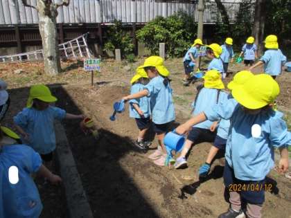 最後にはたっぷり水をやり、「またもも組(4歳児)にも教えてあげようね」と、異年齢の友達と一緒に畑に来ることを楽しみにしているようです。