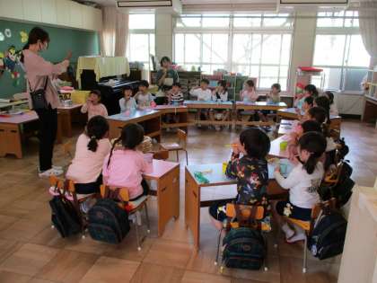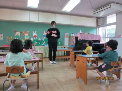 5歳児はもっと丁寧に磨けるように新しい音楽になりました。子どもたちは歯みがきが終わった後、ピカピカの歯を見せてくれます。むしバイキンがつかないようにこれからも歯みがきを頑張ろうね!