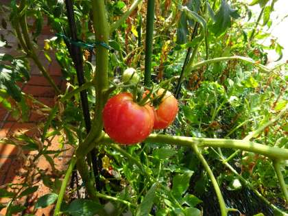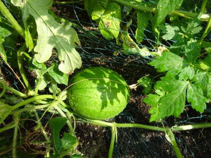 今日の園庭で見つけたものをお知らせします!大玉トマトが赤くなっていましたよ。鮮やかな赤色ですね。これから色が変わりそうなものもありました。小玉スイカも大きくなってきました。中身は赤くなっているのでしょうか…?楽しみですね。