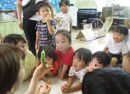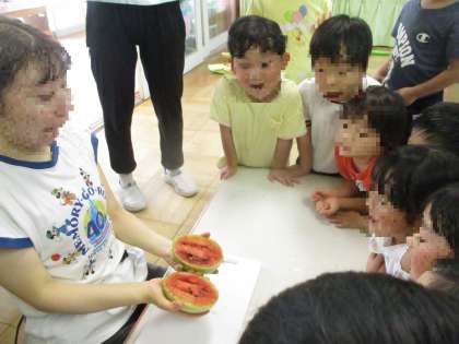 「野菜がたくさんできてるよ!」と気付いた子どもたち。収穫をしていると「収穫祭りだ!」と大喜びでした。小玉スイカもできていたので収穫し、スイカ割をしてみると…赤い実ができていましたよ。「わ〜すごーい!」と喜んでいました。