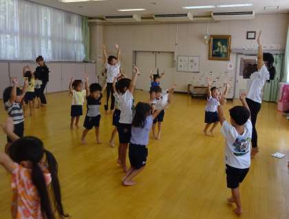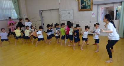 今日はヨガの先生に来ていただき、ヨガをして遊びました。みんなで海に行くと…ヤシの木やクジラに変身したりしましたよ。カニのポーズでは、とても集中して腰を低くしながら横歩きをしていました。回数を重ねるごとにいろいろな動きができるようになり、ヨガの先生も驚いていました。次も楽しみですね。