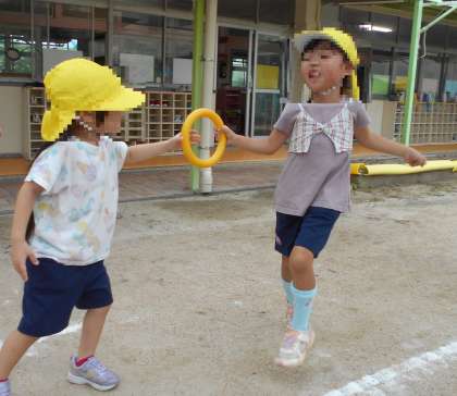 5歳児は毎朝登園後にチャレンジ遊びやリレーごっこをして遊んでいます。今日のリレーでは昨日よりも腕を振って走ったり、コーナーを曲がるときに白線に近付いて走ったりする姿が見られました。全員でバトンをつなぎ、タイムを計ると今日は昨日よりも3秒遅くなってしまいましたが、すぐに「なんでだったんだろう」と話し合いが始まりました。今日の気付きが明日のリレーにどう生かされるのか楽しみです。