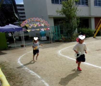 5歳児・4歳児が一緒にリレーをしています。