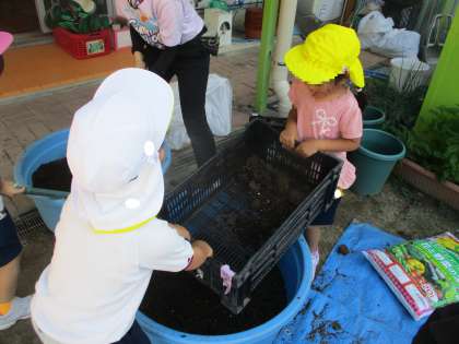 親子栽培の準備 公開日 2025/10/17 更新日 2025/10/17 幼稚園日記 親子栽培に使う土つくりをしていると、子どもたちが 「やりたーい」と集まってきました。 「ダンゴ虫がいるー」と誰かが見つけると 今度はそちらに集まる子どもたち。 虫探しをしたり、土と肥料を混ぜたり、 土をふるったりしました。 いいね(0)