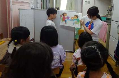 「みんなは今良い姿勢でお話を聞いているかな?」と聞くとすぐに姿勢を正す子どもたち。日頃から自分で意識してできると良いですね。