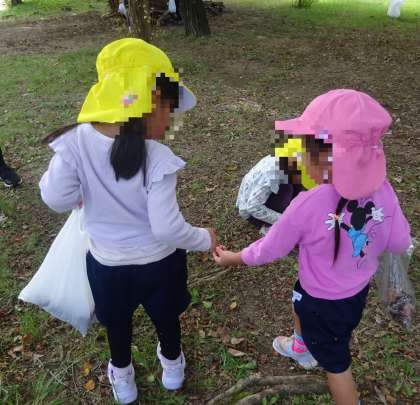 今日は鶴見緑地公園に遠足に行きました。「どんぐりあるかな〜」とワクワクの子どもたち。歩いていくと、大きなドングリや小さいドングリ、マツボックリなどたくさん見つけました。「見てみて、これは帽子かぶってるね」「赤ちゃんドングリ可愛いね」と目を輝かせながら集めていました。袋にたくさんの宝物が集まりましたね。