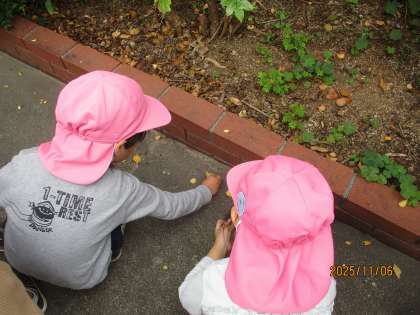 ちいさい秋見つけた 公開日 2025/11/07 更新日 2025/11/07 幼稚園日記 4歳児は色づいてきた葉を見つけて、 みんなで探しに行くことにしました。 赤や黄色の葉っぱや、面白い形の枝をみつけました。 「秋みたいな葉っぱ見つけたー」 「かたつむりみたいな枝だね」 と、いろいろな気づきがあったようです。 「こっちはいい匂いがするよ。なんで?」 「金木犀って言うんだよ」「いい匂いだね」 と、幼稚園にあった秋を見つけて喜んでいました。 いいね(0)