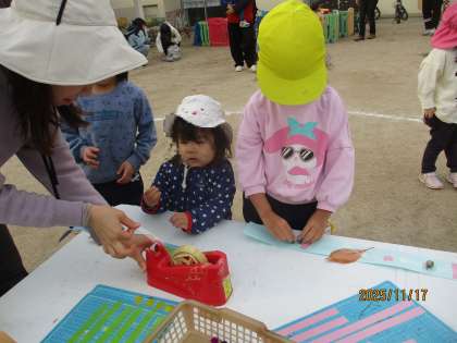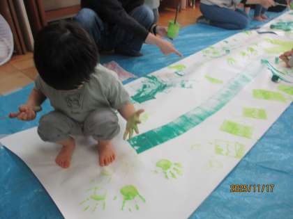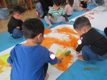 ふれあいなかよしデー 公開日 2025/11/19 更新日 2025/11/19 幼稚園日記 11月17日、園庭開放「ふれあいなかよしデー」がありました。 園庭に秋の自然物を用意しておくと、楽しんで遊ぶ姿が見られました。 なかよしタイムは、絵具遊びをしました。 初めての子もダイナミックに遊んでいました。 できあがった作品は11/28の「こども展覧会」に展示します。 次回のふれあいなかよしデーは12/1です。 なかよしタイムは、「ベビーヨガ」を予定しています。 いいね(0)