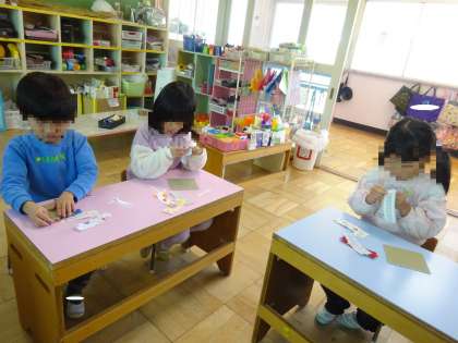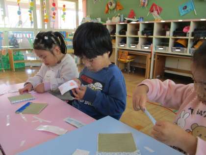 畳についての話を聞いたよ 公開日 2025/12/09 更新日 2025/12/09 幼稚園日記 先日、地域で畳屋さんをされている 元PTA会長さんが、 園児に畳の話をしてくださいました。 畳のことを知った後に 保育室に戻って畳コースターをつくりました。 両面テープを剥がすのは少し難しいようでしたが かわいい畳コースターが出来上がりました。 いいね(0)