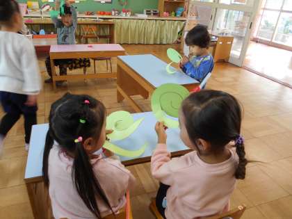 くるくる凧をつくったよ 公開日 2025/12/10 更新日 2025/12/10 幼稚園日記 4歳児はくるくる凧を作りました。 線の上を切るだけではなく、紙を持っている手は紙を少しづつ 動かさないといけません。 真剣に線の上をはみ出さないように切り、くるくる凧を完成させていました。 さっそく園庭で走ってくるくる凧をあげにいきました。 くるくる回る姿が面白く何度も走ってあげていました。 いいね(0)