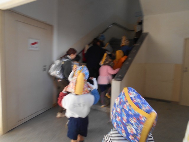 隣接している榎本小学校と合同避難訓練をしました。まずは園庭に避難してから二次避難で小学校の校庭に避難しました。小学生の避難する様子を真剣に見つめていた子どもたち。自分たちもお兄さん、お姉さんのようにと素早くおしゃべりをしないで避難していましたよ。その後、高所避難で小学校の3階まで階段をのぼりました。3階までは大変でしたが、誰も止まったり泣いたりすることなく避難ができ、成長を感じました。命を守るために避難訓練が大切であることを子どもたちも先生たちも感じる避難訓練となりました。