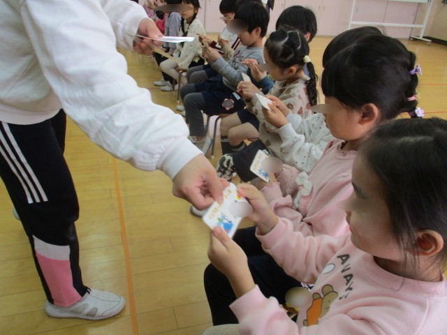 朝9時までに登園すると、幼稚園のくじら列車に乗って、体が大きく、元気に遊べるパワーのプレゼントがもらえます。今日は一人一人にくじら列車の切符を渡しているので、忘れずに持ってきてくださいね。