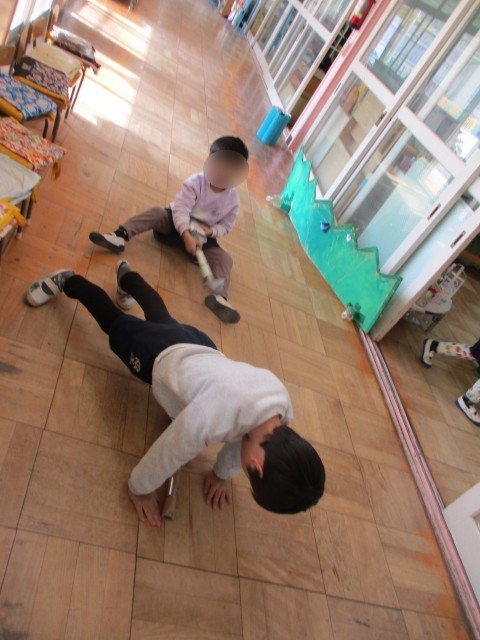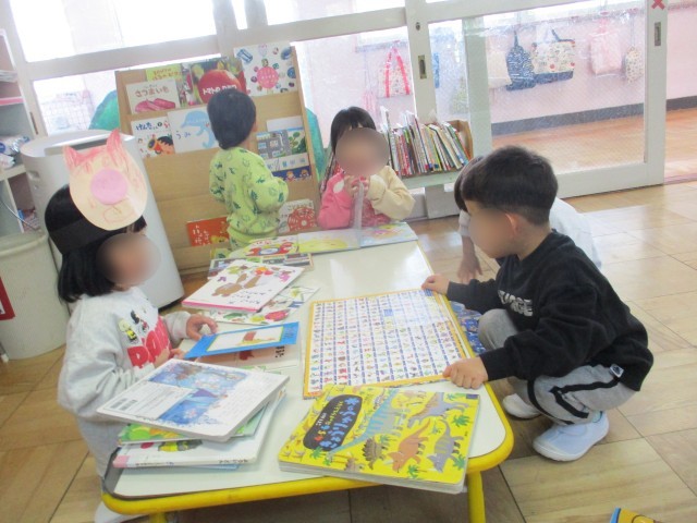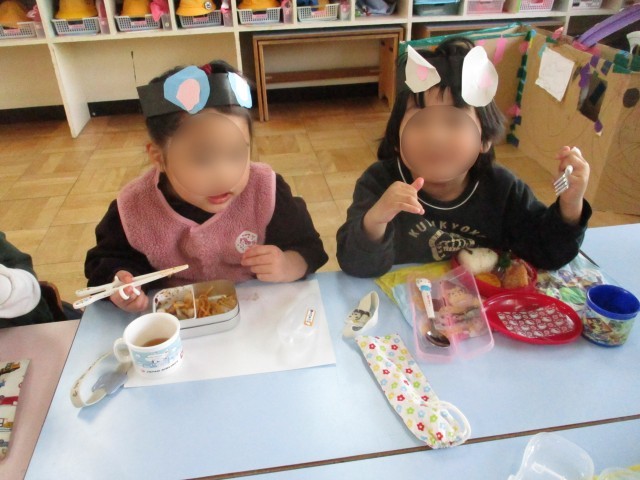 ごっこ遊びを楽しんでいる子どもたち。お弁当を食べてる時も、友達と遊ぶ時も、絵本を読む時も○○になりきっています。こんな風にお話の世界で遊べる仕掛けを担任の先生は工夫しています。