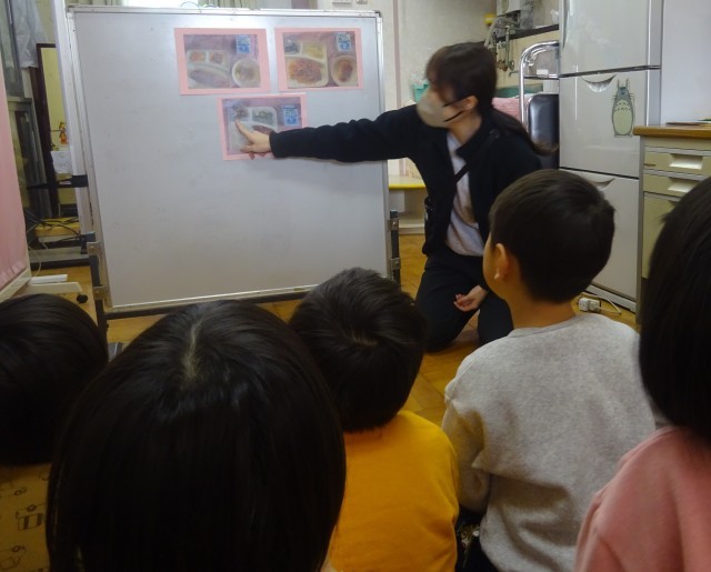 近隣の小学校の給食の写真を見せると「これは食べたことある!」「好きなものがある~!」と大喜び。