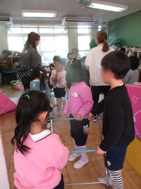 好きな遊びの時間は4歳児と5歳児が毎日関わって遊んでいます。今日は「先生、あのピアノ弾いて」と一緒に「クシコスポスト」を演奏中。「大太鼓もいる」「次は木琴してみたい」と子どもたちの「やってみたい」という意欲を大切に保育をしています。